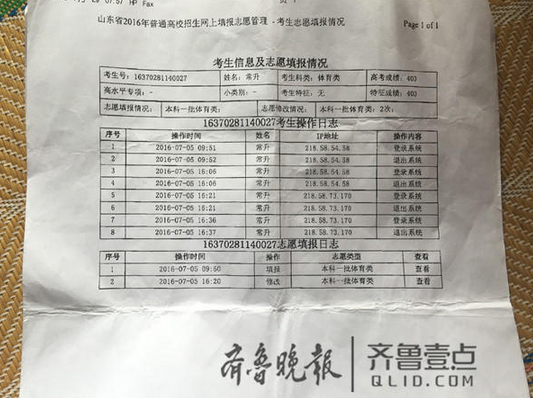 記者注意到,常升在7月5日上午9點51分登陸自己的賬號填報好了志愿之后便離開,但是當天下午4點多,常升的賬號再次在同一臺電腦上登陸,而接下來賬號又在另外一個IP地址上連續(xù)登陸兩次,并且用完了兩次修改志愿的機會。“我就登陸過一次,在遲老師的電腦上?!背If,后面的三次操作他都不知道是誰所為。根據(jù)IP地址提供的線索,無論是誰修改了常升的志愿,都在遲老師的電腦上進行過操作,然后又用另一臺電腦將常升的改志愿次數(shù)用完。常升的準考證和密碼一直在自己手里保管,唯一有機會修改他志愿的就是自己的同窗好友郭某?!拔覀冴P系很好,我填志愿的時候他就在旁邊,我也沒防著他?!背If,事發(fā)之后他找過郭某,對方也私下承認了修改了常升志愿的事實,原因則是郭某擔心常升的分數(shù)更高,他怕常升擠掉自己,讓自己沒學上。隨后,為了挽回常升的損失,雙方家長進行了商談。圖為常升的賬號修改志愿的記錄。