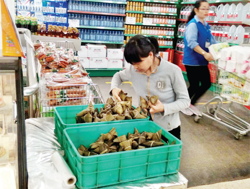 6月2日,市民在城區(qū)超市里買粽子、挑粽葉(張志遠(yuǎn) 許凈 攝)