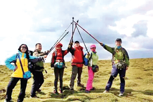 我們不曾相識,一點愛溫暖了人間。從東臺下來,一開始就不見了女兒,還好有閨蜜在身邊談天說地,偶爾“龍哥”擦身而過扔下一句笑話,轉眼就不見了蹤影;劉教授常跑國外,腿很長,頭戴禮帽,不用登山杖,腳步輕盈;“大師兄”人見人愛,他的腰間掛一個袋子,是用來裝路上撿到的水瓶、塑料袋、果皮等垃圾的,他身上的雨衣、登山杖好像是給大伙準備的,誰需要就送給誰;郭大律師看見剛從山下上來,上氣不接下氣、氣喘不停的同行人,忙把自己的雨衣翻過來鋪在大石頭上讓人坐?!吧裢取笨偸窃陉犖榈淖詈?,落在后面的人,只要看見“神腿”就信心倍增,和“神腿”合張影,比出個“二”的手勢,仿佛自己也是“神腿”了。吳老師人很好,熱情地幫我拍了一張“打坐”的美照,真可謂不懂攝影的老師不是優(yōu)秀企業(yè)家;見到海濤群主不時從山上往山下跑,照顧落在后面的人;又遇見一位腰間掛垃圾袋的人,他走近一頭正在喂奶的母牛,像老朋友一樣輕輕地撫摸這牛的頭部,聽說他是講國學的馬老師。佛家講的是一種緣分,有緣自然來相會,我和馬老師聊著爬上了一個山頭,心頭一怔,馬老師不就是我們的學問大咖嗎?我們的八月大朝臺隊伍里藏龍臥虎,稍不留神,大咖就會從你身邊溜走。正說著,閨蜜劉老師從我身邊經過,腰間掛著一袋子垃圾,直向前面一個易拉罐追去……