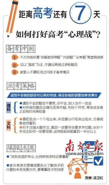 在應(yīng)考時(shí),遇到不會(huì)做的題目可以暫時(shí)存放,保證會(huì)做的題要能夠拿滿分?!袄砜朴龅讲粫?huì)的題目不要慌,你不會(huì),別人也不一定會(huì)。因?yàn)楦呖际沁x拔性考試,一部分題目有一定的難度,極少可能得滿分?!弊鳛樾睦韺W(xué)專家,張敏強(qiáng)透露,心理學(xué)實(shí)驗(yàn)證明,在考試高強(qiáng)度的關(guān)注力下,第一眼看到會(huì)做的題目大多是對(duì)的。由此他建議考生,假如對(duì)所做的題目正確與否有懷疑,可先標(biāo)個(gè)符號(hào),不要當(dāng)時(shí)糾纏對(duì)與不對(duì),這樣會(huì)影響下面做題的判斷,正確的做法是完成全卷之后有時(shí)間再檢查。