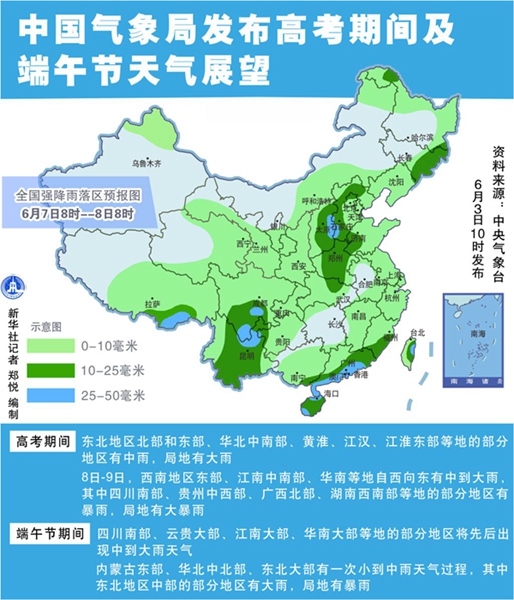 新華社北京6月3日電(記者于文靜、林暉)今年高考期間(6月7日至9日),我國(guó)中東部地區(qū)無(wú)明顯高溫天氣,大部地區(qū)有陣雨或雷陣雨天氣。端午節(jié)期間(6月9日至11日),四川南部、云貴大部、江南大部、華南大部等地的部分地區(qū)將先后出現(xiàn)中到大雨天氣。