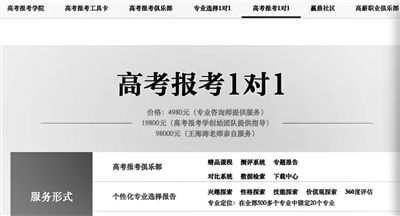 北青報(bào)記者發(fā)現(xiàn),面對(duì)考生家長(zhǎng)對(duì)于志愿填報(bào)的“迫切需求”,目前高考志愿填報(bào)咨詢的價(jià)格都在幾千元到幾萬(wàn)元不等。這位潘姓工作人員表示,該機(jī)構(gòu)設(shè)有線上、線下志愿填報(bào)兩套方案,其中線上填報(bào)方案價(jià)格為3980元,志愿填報(bào)咨詢老師與學(xué)生并不見面,而是通過(guò)QQ、郵件等方式為學(xué)生和家長(zhǎng)出具志愿填報(bào)方案。而線下志愿填報(bào)方案為1對(duì)1有針對(duì)性的填報(bào),但是根據(jù)咨詢經(jīng)驗(yàn)的多寡收費(fèi)也不相同?!氨热缥覀冇衅甙四晷袠I(yè)經(jīng)驗(yàn)的呂老師收費(fèi)是22800元,有6年經(jīng)驗(yàn)的郭老師收費(fèi)是20800元,要是有3年經(jīng)驗(yàn)的李老師收費(fèi)則為16800元?!贝送?,一家名為融聚未來(lái)的機(jī)構(gòu)的高姓負(fù)責(zé)人也向記者介紹,該機(jī)構(gòu)高考志愿填報(bào)1對(duì)1服務(wù)的價(jià)格在8000元到2萬(wàn)元以內(nèi)。最讓人吃驚的是,一家名為贏鼎教育的高考報(bào)考機(jī)構(gòu),在官網(wǎng)上明示的高考報(bào)考1對(duì)1項(xiàng)目中明確標(biāo)價(jià),專業(yè)咨詢師提供服務(wù)的收費(fèi)4980元,高考報(bào)考學(xué)創(chuàng)始團(tuán)隊(duì)提供指導(dǎo)的收費(fèi)為19800元,王海濤老師親自服務(wù)的標(biāo)價(jià)為98000元。