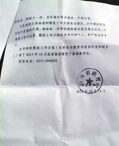 山西省教育廳基礎(chǔ)教育處一名工作人員向新京報記者確認,上述文件由省廳于2015年10月12日下發(fā),具有行政效力。