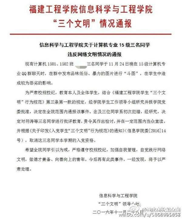 近日,一則“福建工程學(xué)院某專業(yè)三名學(xué)生因在QQ群上‘斗圖’,被學(xué)校通報批評”的微博在網(wǎng)絡(luò)上傳播。 《通報》稱,三名學(xué)生在群里發(fā)布了品位低俗、暴力的進(jìn)行“斗圖”,違反了“網(wǎng)絡(luò)文明”,決定對三名同學(xué)進(jìn)行批評教育,并取消相關(guān)同學(xué)本學(xué)期的入黨資格。 對此,福建工程學(xué)院信息科學(xué)與工程學(xué)院一名知情教師表示,該份《通報》確實(shí)出自學(xué)院,“外界沒有看到群里的內(nèi)容,想象不到有多嚴(yán)重?!彼嬖V澎湃新聞,除了在QQ群里發(fā)布大量低俗、暴力圖片外,在學(xué)院黨委書記的提醒下,三位同學(xué)不僅沒有收斂,反而在群里調(diào)侃黨委書記。