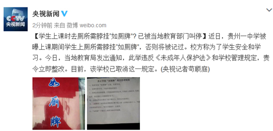 近日,貴州一中學(xué)被曝上課期間學(xué)生上廁所需脖掛“如廁牌”,否則將被記過。校方稱為了學(xué)生安全和學(xué)習(xí)。今日,當(dāng)?shù)亟逃职l(fā)出通知,此舉違反《未成年人保護(hù)法》和學(xué)校管理規(guī)定,責(zé)令立即整改。目前,該學(xué)校已取消這一規(guī)定。