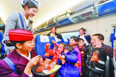 1月24日,在重慶開往福州的G1755次列車上,乘務(wù)員和“小候鳥”做游戲。春運期間,大批務(wù)工人員子女隨長輩踏上與父母團聚的旅途,南鐵福州客運段提前對重點線路乘務(wù)組進行兒童陪護培訓(xùn),在列車上準(zhǔn)備了書本和玩具,用愛心護航“小候鳥”的團圓路。新華社記者 宋為偉攝