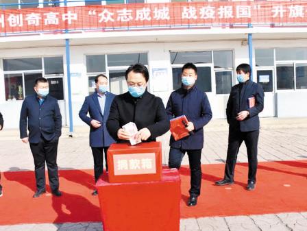 捐贈(zèng)儀式上,三方代表簽訂定向捐贈(zèng)協(xié)議書,市民政局社會(huì)捐助事務(wù)中心張志堅(jiān)主任為創(chuàng)奇高中頒發(fā)捐贈(zèng)證書。創(chuàng)奇高中黨支部書記王志明表示,疫情發(fā)生以來,忻州市人民醫(yī)院在承擔(dān)繁重的全市病患救治工作的同時(shí),積極援鄂救助,醫(yī)護(hù)人員舍小家顧大家,奮戰(zhàn)在最危險(xiǎn)的一線,是我們的守護(hù)神,是最美的逆行者,全體創(chuàng)奇人應(yīng)該向他們致敬。與此同時(shí),創(chuàng)奇高中也積極響應(yīng)黨中央、省市區(qū)黨委的號(hào)召,用實(shí)際行動(dòng)支持我市疫情防控工作,在向全校師生發(fā)出捐款倡議后,得到廣大師生的鼎力支持。我們?yōu)槟茉谶@場全國性的戰(zhàn)役中貢獻(xiàn)自己的一點(diǎn)綿薄之力而感到榮幸。讓我們眾志成城,攜手共進(jìn),用大愛情懷筑起一道道阻擊疫情的牢固防線。