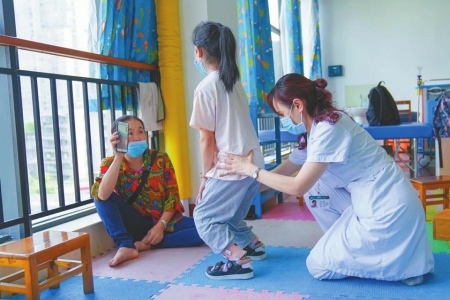 醫(yī)生引導(dǎo)小春梅做步姿訓(xùn)練。