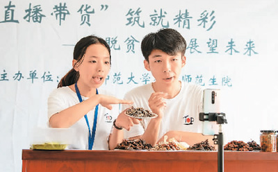 7月24日,在江西省吉安市新干縣潭丘鄉(xiāng)產(chǎn)業(yè)就業(yè)扶貧服務(wù)中心,江西師范大學(xué)暑期社會(huì)實(shí)踐大學(xué)生正在直播推銷當(dāng)?shù)剞r(nóng)家小吃醬餅,助力鄉(xiāng)村振興。李福孫攝(人民視覺(jué))