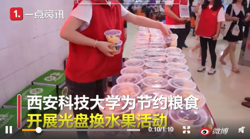 西安科技大學為節(jié)約糧食開展了光盤換水果的活動,學生們只要把飯菜吃完清盤,就可以換到一份飯后果盤和代金券。校方介紹,他們每餐準備了500份水果,該活動推出之后,收餐量減少了40%到50%。