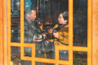 在德格縣麥宿鎮(zhèn)的扎堪倉黑陶工坊,達(dá)瓦卓瑪(右)向工坊主理人降擁格乃了解工坊近期的經(jīng)營情況以及新品研制進(jìn)展。新華社記者 沈伯韓攝
