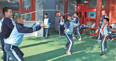 北京市東城區(qū)黑芝麻胡同小學(xué)圓恩寺校區(qū)位于一條胡同里,空間略顯局促。學(xué)校發(fā)布了“課間活動(dòng)征集令”,把課間15分鐘交給學(xué)生自己設(shè)計(jì)和策劃?!熬幓ɑ@3個(gè)人就能玩,不占地方”“可以觀察、養(yǎng)護(hù)池塘邊的植物”“華容道、九連環(huán)”……學(xué)生們紛紛為課間活動(dòng)支招。