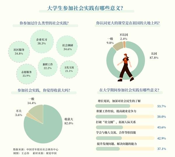 調查顯示,87.8%的受訪大學生認同,更大的課堂在祖國的大地上。對于參加社會實踐的意義,受訪大學生把增長見識,加深對社會民生的了解排在首位,獲選率為53.7%,積累工作經驗,提高就業(yè)競爭力(50.0%),打破“社交圈”,拓展人際關系(43.6%)分別排在第二、三位。
