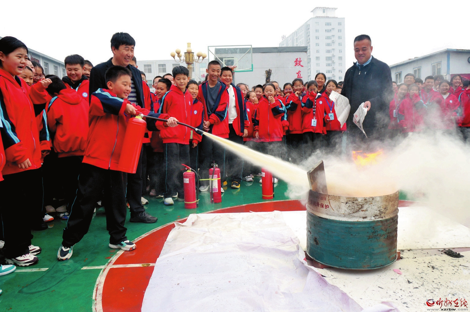 為了提升學?;馂氖枭⒔M織和管理能力,強化師生安全意識,培養(yǎng)師生的自救能力,10月31日,忻州市第七中學舉行消防應急疏散演練。圖為學生使用滅火器滅火。(張卯芳 攝)