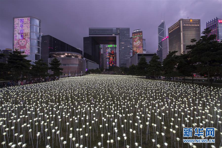 這是在中環(huán)海濱拍攝的白玫瑰花燈(2月13日攝)。 2月13日,來自韓國(guó)首爾的LED Rose Garden大型公共展覽亮相香港。25000朵LED白玫瑰花燈在中環(huán)海濱展出,在情人節(jié)即將到來之際點(diǎn)亮維港,營(yíng)造出浪漫甜蜜的氛圍。新華社記者 呂小煒 攝