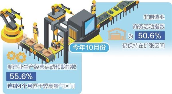 從市場預期看,10月份,制造業(yè)生產經(jīng)營活動預期指數(shù)為55.6%,比上月上升0.1個百分點,連續(xù)4個月位于較高景氣區(qū)間,制造業(yè)企業(yè)對市場發(fā)展信心穩(wěn)定。