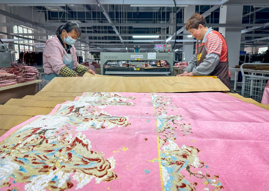 4月11日,在曹縣有愛云倉漢服基地,工作人員在進行馬面裙壓褶工序。新華社記者 王陽 攝