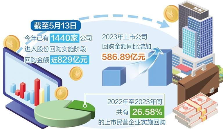 A股上市公司股份回購熱持續(xù)升溫。Wind數(shù)據(jù)顯示,截至5月13日,今年已有1440家公司進(jìn)入股份回購實(shí)施階段,合計(jì)回購金額近829億元,遠(yuǎn)超去年同期的247億元。中國上市公司協(xié)會(huì)數(shù)據(jù)顯示,2023年上市公司回購金額同比增加586.89億元,增長108.82%。