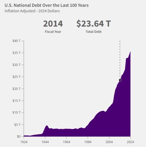 △美國財政部下屬的財務數(shù)據(jù)網(wǎng)站披露的數(shù)據(jù)顯示,美國國債總額從2014年的23.64萬億美元升至2024年的超36萬億美元,漲幅超52%,這一趨勢整體上仍在持續(xù)加快。