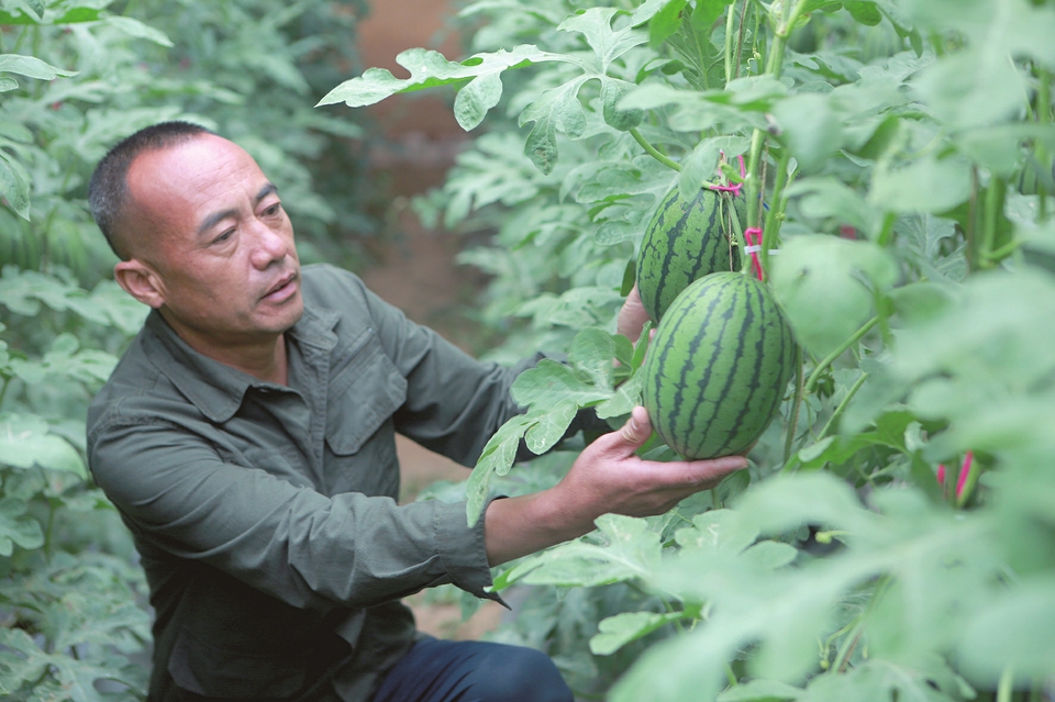 邢俊成正在查看西瓜長勢。