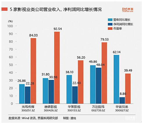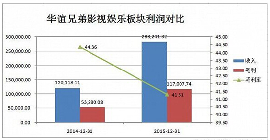 據(jù)界面報(bào)道,根據(jù)財(cái)報(bào)顯示,華誼兄弟2015年影視娛樂版塊營業(yè)收入較上年同期相比增135.80%,達(dá)到28.32億元,營業(yè)成本較上年同期增長135.80%,達(dá)到16.62億,毛利率較上年減少了3.05%,達(dá)到41.35%。在報(bào)告期內(nèi),公司上映的主要是《奔跑吧兄弟》《天將雄師》《梔子花開》、《命中注定》《尋龍?jiān)E》《老炮兒》等16部,電影的總票房約43億。