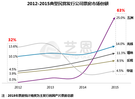 根據(jù)藝恩研究報(bào)告顯示,華誼兄弟從2012年的13.6%的市場份額一路跌至2015年的4.5%,而由萬達(dá)影視牽頭的五洲發(fā)行市場份額一路從0.3%飆升至25%,華誼的電影份額被一路碾壓。而萬達(dá)影視也即將以注入上市公司的方式登陸A股市場。