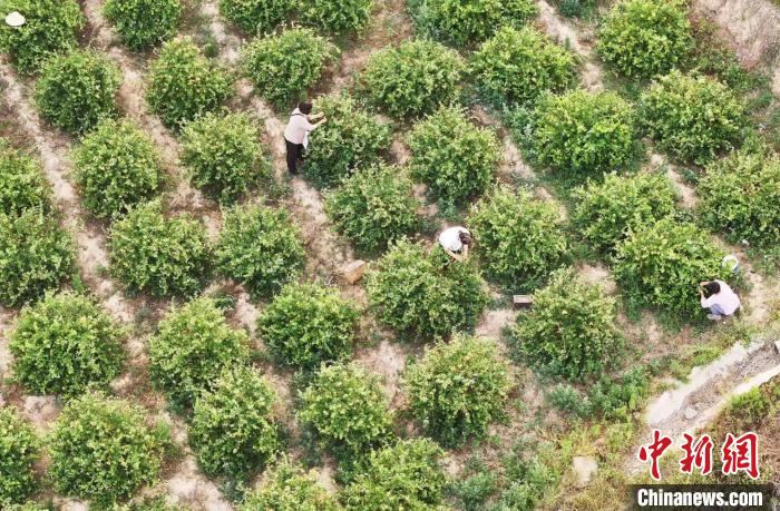 山西省運(yùn)城市新絳縣澤掌鎮(zhèn)喬溝頭村,幾名花農(nóng)在田間采摘金銀花。(無人機(jī)照片)高新生 攝
