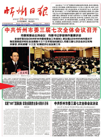 中國共產(chǎn)黨忻州市第三屆委員會(huì)第七次全體會(huì)議于12月28日在忻州召開。全會(huì)聽取討論了《中共忻州市委常委會(huì)工作報(bào)告》,審議通過了《中共忻州市委關(guān)于制定國民經(jīng)濟(jì)和社會(huì)發(fā)展第十三個(gè)五年規(guī)劃的建議》,研究部署了“十三五”時(shí)期經(jīng)濟(jì)社會(huì)發(fā)展工作。