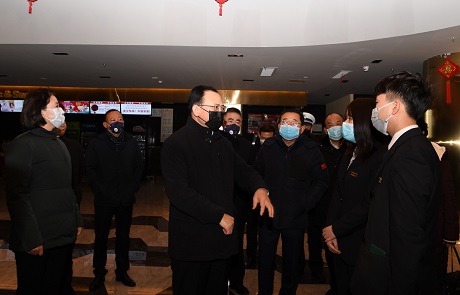 省人大常委會副主任、市委書記李俊明在開萊橫店影城檢查娛樂場所暫停營業(yè)執(zhí)行情況 本報記者 劉紀(jì)森 攝