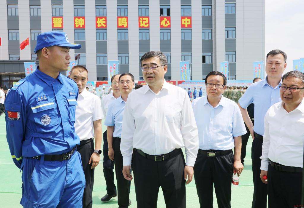 檢查消防救援大隊、礦山救援隊和藍(lán)天救援隊的應(yīng)急裝備器材。范濤 攝