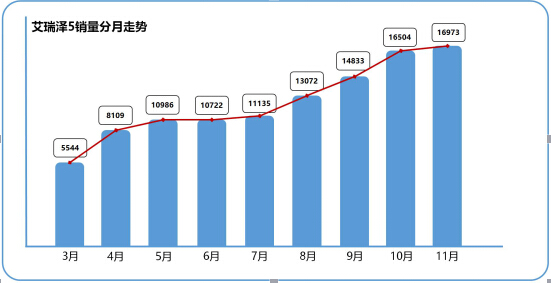 和SUV市場(chǎng)相比,自主品牌在轎車領(lǐng)域的表現(xiàn)一直差強(qiáng)人意,但是,今年奇瑞推出的一款中級(jí)家轎可謂是出盡風(fēng)頭,上市253天銷量突破10萬(wàn)輛,11月份銷量達(dá)到16973輛,刷新了自主轎車新車型銷量增速記錄。在11月份舉辦的廣州國(guó)際車展期間,艾瑞澤5更是一口氣拿了11項(xiàng)大獎(jiǎng),堪稱拿獎(jiǎng)拿到手軟。