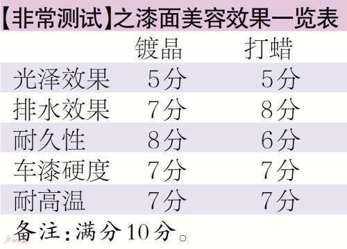 車天下君在兩塊車身試驗面板上進行測試,一塊鍍晶,一塊打蠟。全部按照說明書手工操作。車天下君是個理工男,做這些事情還算是輕車熟路。完工對比光澤效果,在都沒有拋光處理的情況下,鍍晶和打蠟都沒有起到提升漆面光澤的效果,給予“不及格”的差評。潑上水,漆面都形成水珠,但仔細比較,會發(fā)現打蠟的排水效果比鍍晶要好。