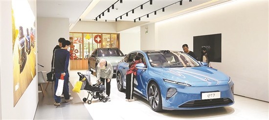 某蔚來空間體驗(yàn)店內(nèi),購(gòu)車者正在體驗(yàn)新車