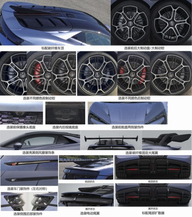 車(chē)尾部分,貫穿式尾燈組結(jié)合造型新穎的擾流板與碳纖維材質(zhì)后引擎蓋極具辨識(shí)度。仰望U9還配備夸張的尾部擴(kuò)散器組件。除此之外,新車(chē)還可以選裝碳纖維固定大尾翼以及選裝電動(dòng)尾翼。新車(chē)的輪胎尺寸為275/35 R21和325/30 R21。車(chē)身尺寸方面,新車(chē)長(zhǎng)寬高分別為4966/2029/1295(1338)mm,軸距為2900mm。動(dòng)力方面,仰望U9搭載四電機(jī)驅(qū)動(dòng)系統(tǒng),電機(jī)的最大功率為960kW。