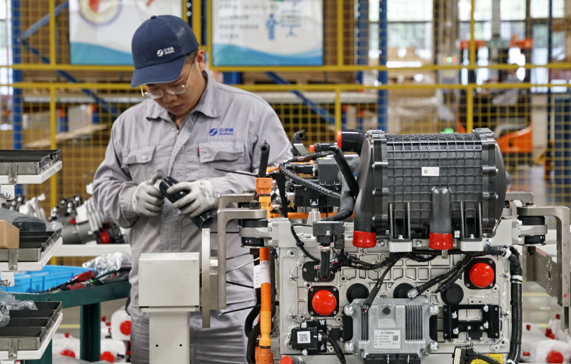 圖為在北京大興國(guó)際氫能示范區(qū)內(nèi),一家生產(chǎn)氫能燃料電池發(fā)動(dòng)機(jī)企業(yè)的員工在裝配設(shè)備。新華社記者 李欣 攝