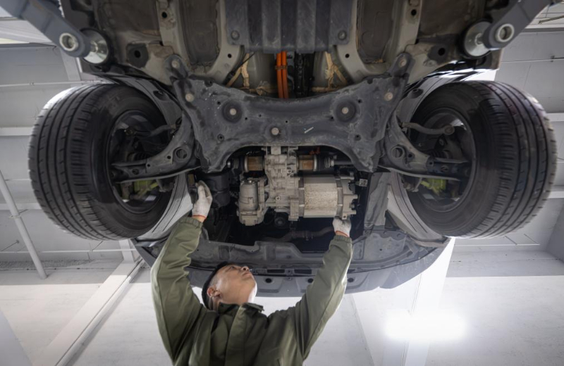 12月5日,一名新能源汽車維修師在檢查一輛新能源汽車的電機。新華社記者 肖藝九 攝