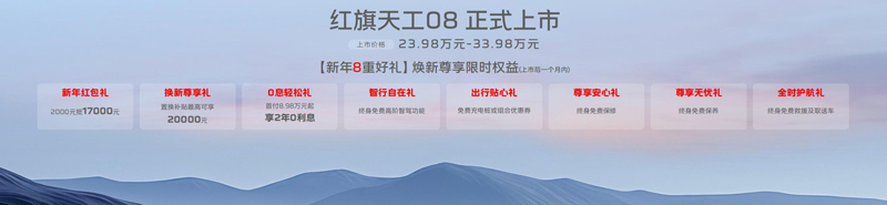 逐夢新程,臻享超值。天工08共推出兩驅和四驅2種驅動模式共5個版本供選擇,官方指導價為23.98萬元-33.98萬元。同時,購買天工08的消費者還可尊享“新年8重好禮”限時權益,即刻購車可享2000元抵17000元的新年紅包禮;置換補貼最高可享20000元的換新尊享禮;首付8.98萬元起、享2年0利息的0息輕松禮;終身免費高階智駕功能的智行自在禮;免費充電樁或組合優(yōu)惠券的出行貼心禮;終身免費保修的尊享安心禮;終身免費保養(yǎng)的尊享無憂禮;終身免費救援及取送車的全時護航禮。從購車成本到金融方案,再到智駕裝備、質量保障等方方面面,紅旗以超值權益帶來進階的價值體驗,讓用戶買得舒心、用得安心。