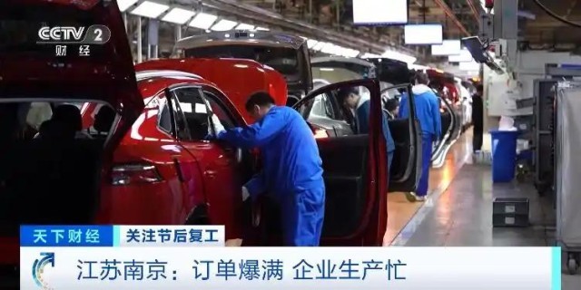 在南京市江北新區(qū)的一家大型汽車(chē)生產(chǎn)企業(yè),其中一個(gè)車(chē)間面積4萬(wàn)平方米,產(chǎn)線從腳下延伸到了頭頂,工作人員正在緊張忙碌著,一輛輛嶄新的汽車(chē)高效地走向流水線。這里每天可以生產(chǎn)汽車(chē)1000輛左右。一些剛剛上市的新款新能源汽車(chē)產(chǎn)品,銷(xiāo)售非?;鸨?,訂單已經(jīng)排到了今年下半年。正月初五這里已經(jīng)全員在崗趕訂單。這個(gè)車(chē)間,每天兩個(gè)班組,1200多名工人日夜在崗,這個(gè)數(shù)字是去年春節(jié)同期的2.5倍。