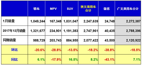 2018年1月我國狹義乘用車銷量為2247639輛,同比增長8.2%,環(huán)比下滑18.2%。崔東樹認(rèn)為,今年1月份沒有處于春節(jié)假期之中,有效銷售日有所增加,因此汽車銷量出現(xiàn)小幅增長。