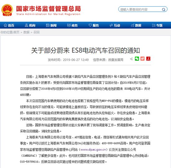 日前,上海蔚來汽車有限公司向國家市場監(jiān)督管理總局備案了召回計(jì)劃。自2019年6月27日起,召回部分搭載了2018年4月2日到2018年10月19日期間生產(chǎn)的動力電池包的蔚來