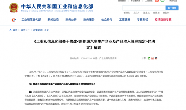 據(jù)悉,《工業(yè)和信息化部關(guān)于修改〈新能源汽車生產(chǎn)企業(yè)及產(chǎn)品準(zhǔn)入管理規(guī)定〉的決定》已經(jīng)在2020年7月14日工業(yè)和信息化部第16次部務(wù)會(huì)議審議通過,現(xiàn)予公布,自2020年9月1日起施行。