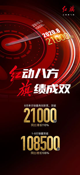 近日,紅旗對(duì)外發(fā)布8月銷售數(shù)據(jù)顯示:?jiǎn)卧驴備N量突破2.1萬(wàn)輛,同比增110%,其中HS5單品月銷過(guò)萬(wàn)。1-8月,紅旗累計(jì)銷量突破108500輛,同比增長(zhǎng)108%,繼續(xù)書(shū)寫(xiě)“新紅旗速度”。