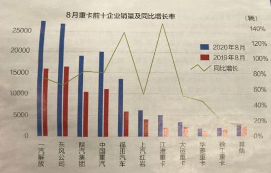8月,在重卡市場(chǎng)高速增長(zhǎng)的帶動(dòng)下,排名前十的重卡企業(yè)均實(shí)現(xiàn)了同比增長(zhǎng)。