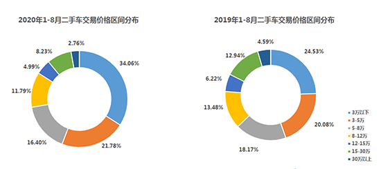 1-8月,全國二手車市場累計(jì)交易量811.47萬輛,同比下降12.50%。其中,3萬元及以下價(jià)格區(qū)間的車輛增長9.53%;3-5萬區(qū)間增長1.70%;5-8萬區(qū)間下降1.76%;8-12萬區(qū)間下降1.69%;12-15萬區(qū)間下降1.23%;15-30萬區(qū)間下降4.71%;30萬區(qū)間以上下降1.83%。