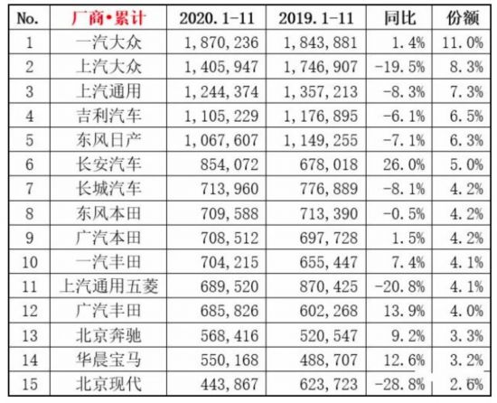12月10日,乘用車廠商十五強(qiáng)銷量榜單正式公布,其中漲跌各占半,雖然還剩下最后一個(gè)月銷量未能確定,但目前年度排名已經(jīng)基本成型。