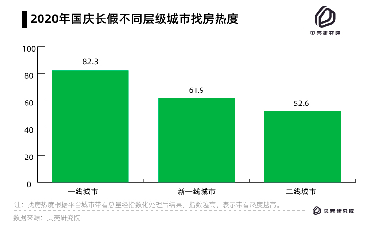 一個城市房產經紀人帶客戶看房量——總帶看量,是衡量樓市熱度重要指標。10月1日-7日,一線城市找房熱度高于新一線、二線城市。從城市之間熱度比較看,四個一線城市總帶看熱度指數為82.3,明顯高于新一線城市的61.9和二線城市52.6。