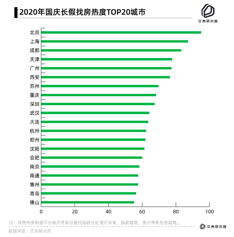 貝殼研究院對十一假期(10月1日-7日)平臺帶看數據統計顯示,北京“總帶看量”突破了5萬次,同比去年2.96萬次增幅明顯,位居城市排行榜第一名;上海與成都以4.2萬次和3.7萬次分列二三名。