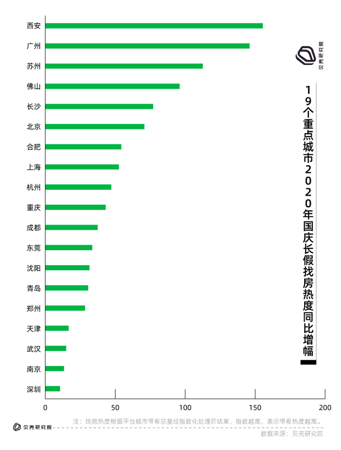10月9日,貝殼找房發(fā)布了2020年城市“十一”找房熱度(二手房市場),全國多個城市找房活躍度同比去年均不同程度增長,其中西安、廣州、蘇州樓市相對火熱,經紀人總帶看量同比出現了翻倍增長;而深圳、南京樓市趨冷,總帶看量增幅排在19個重點城市最后。