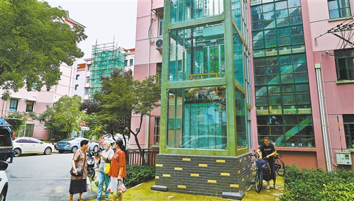 在上海市長寧區(qū)北新涇街道新涇六村,居民在加裝了電梯的12號樓旁聊天(新華社記者 方喆/攝)