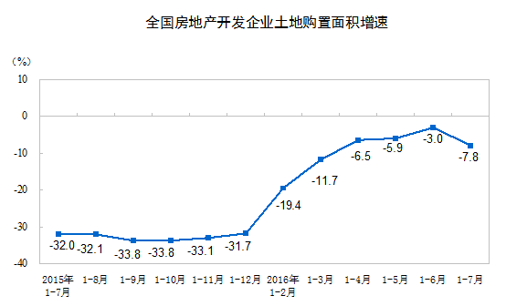 1-7月份,房地產(chǎn)開發(fā)企業(yè)土地購(gòu)置面積11167萬平方米,同比下降7.8%,降幅比1-6月份擴(kuò)大4.8個(gè)百分點(diǎn);土地成交價(jià)款3848億元,增長(zhǎng)7.1%,增速回落3.1個(gè)百分點(diǎn)。
